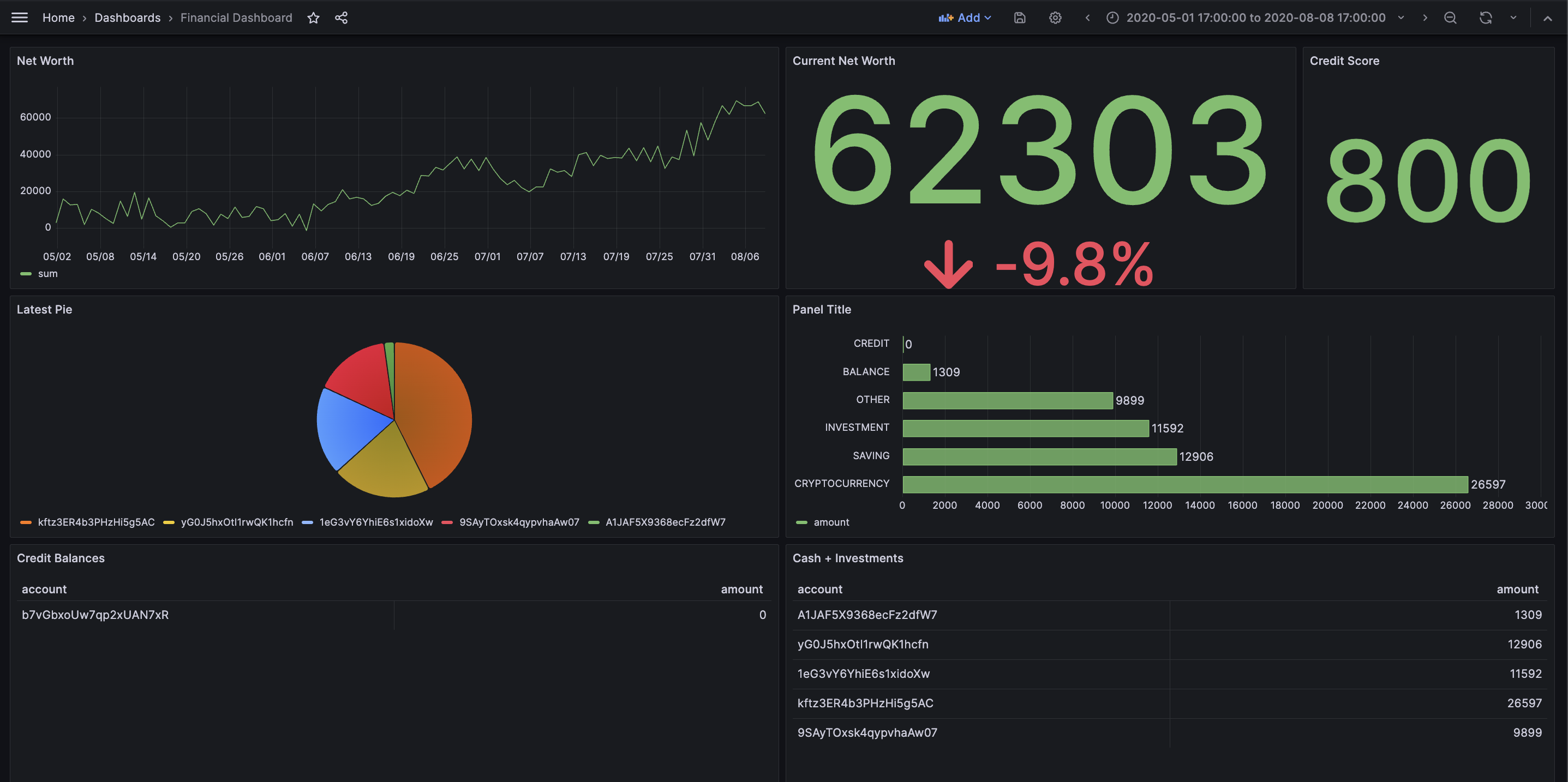 A Grafana dashboard, connected to a PostgreSQL database to visuialize financial data across multiple user accounts. I have written